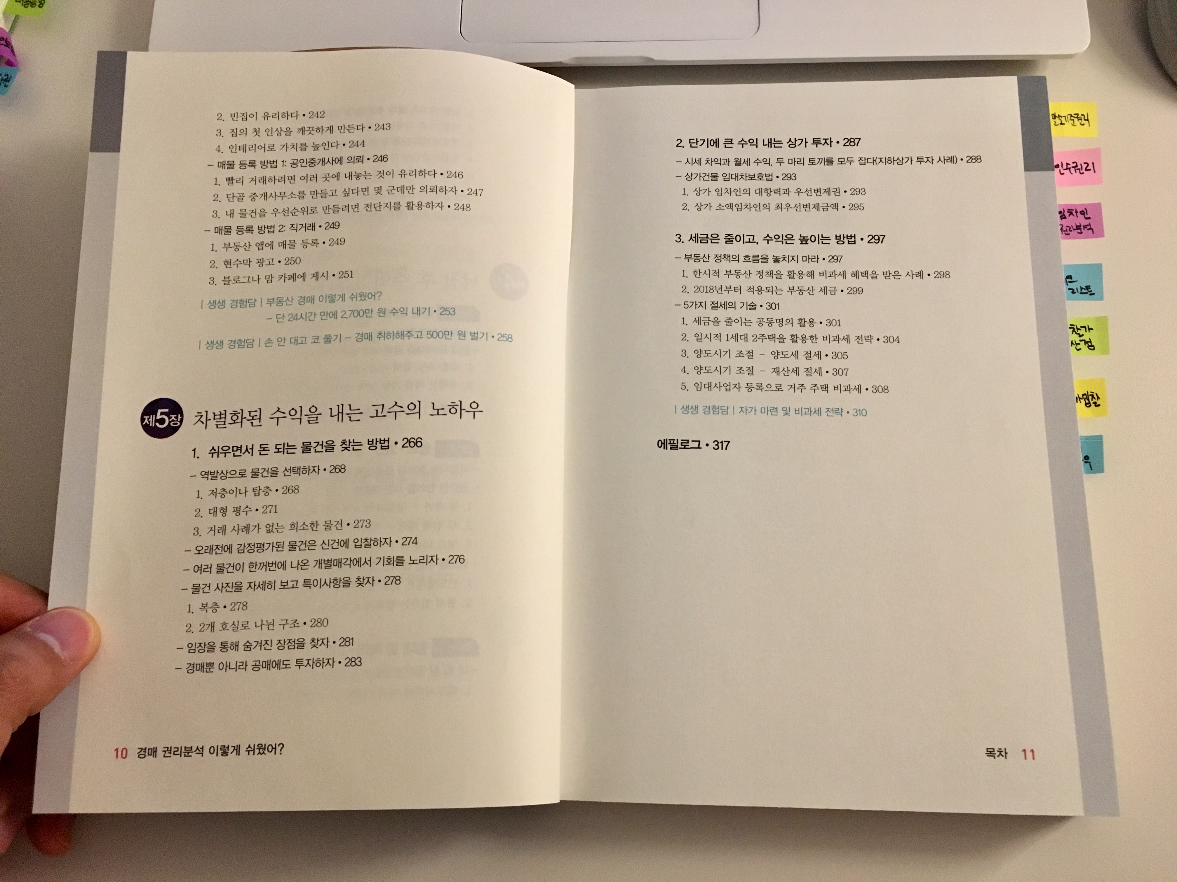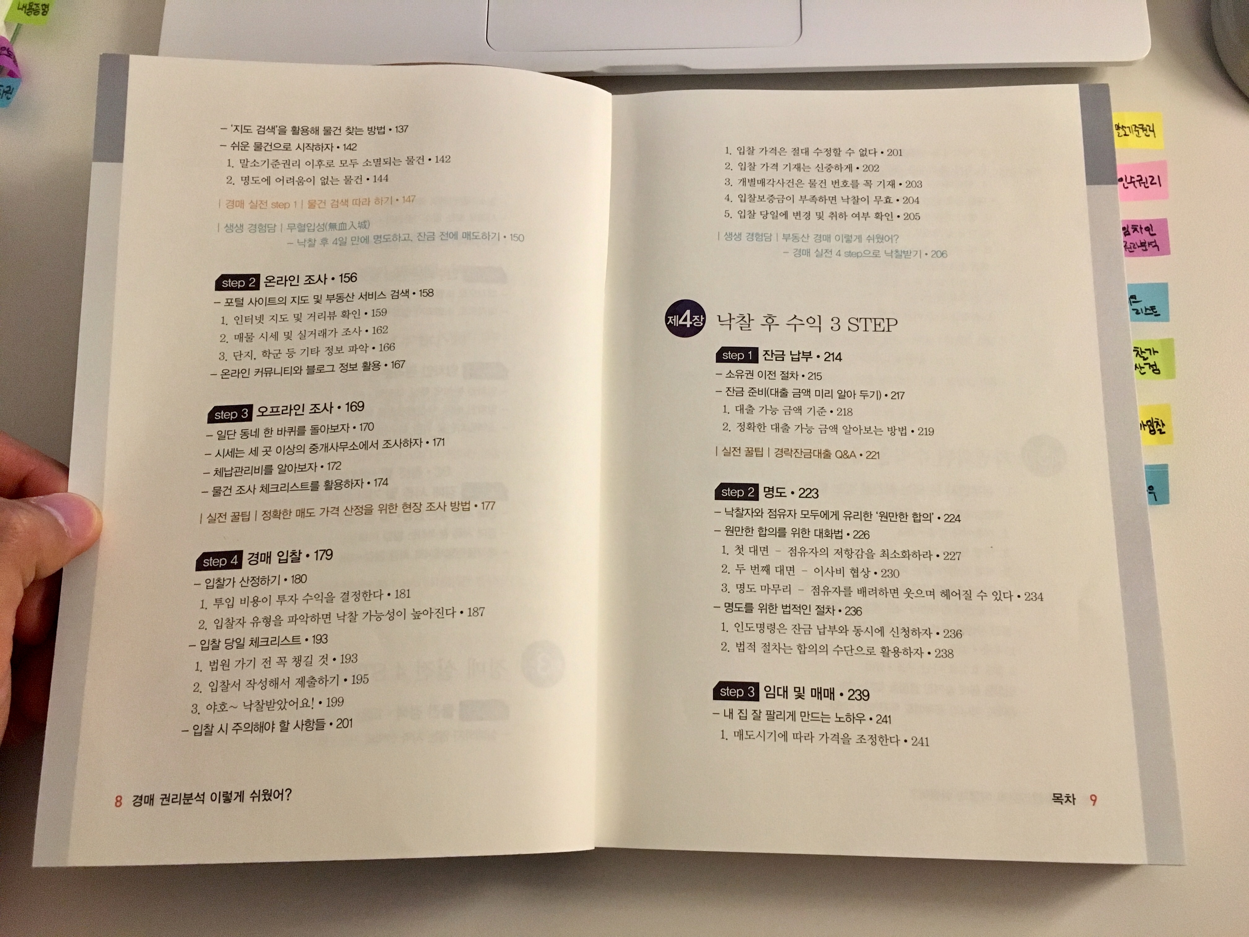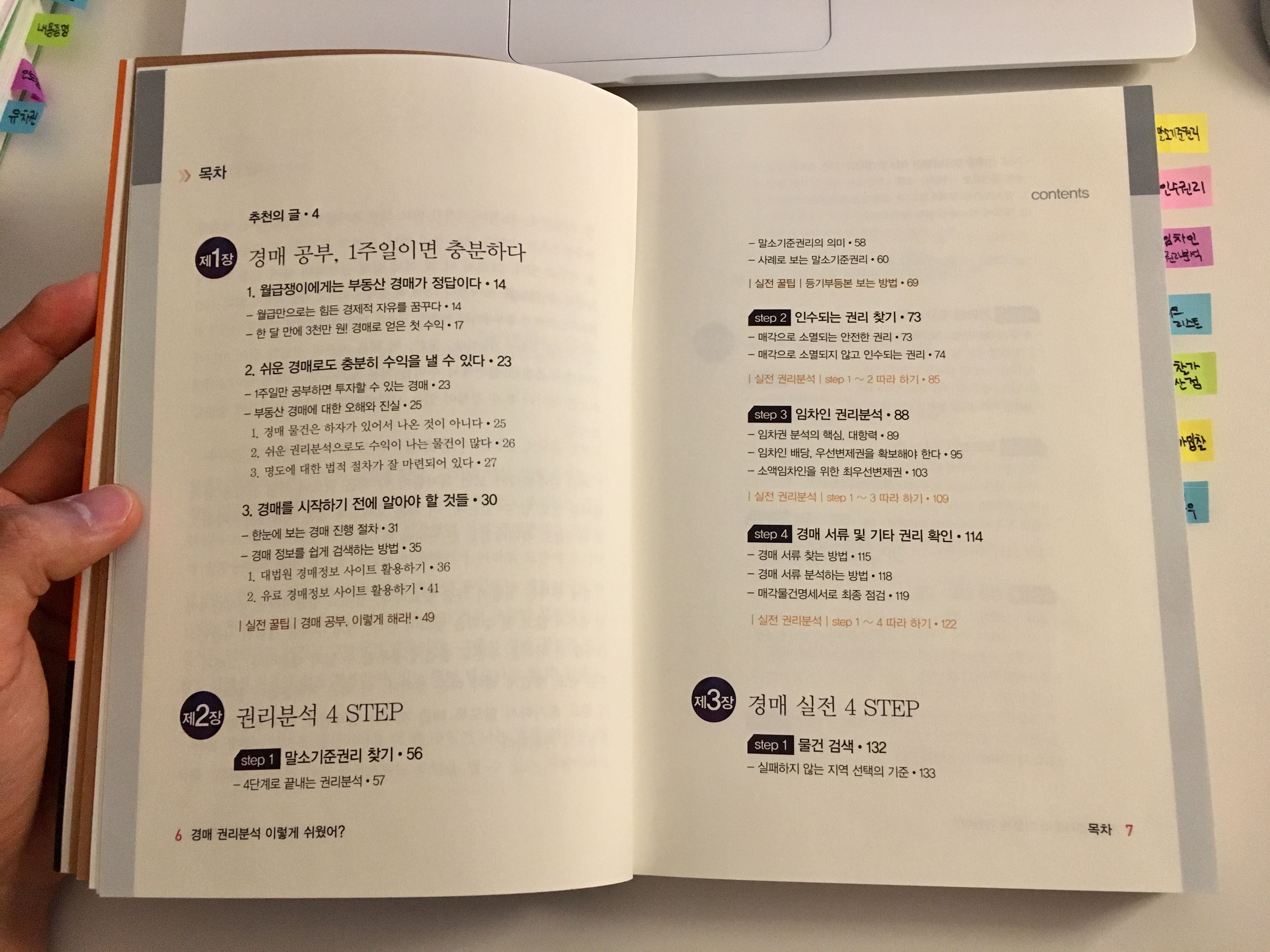 목차는 직장인이라도 쉬운 경매로 수익을 낼 수 있다는 점, 말소기준권리, 인수되는 권리, 임차인 권리분석, 경매 서류 및 기타 권리, 온라인과 오프라인으로 물건조사, 경매입찰, 잔금납부, 명도, 임대 및 매매, 노하우, 절세방법 등이 담겨 있습니다.