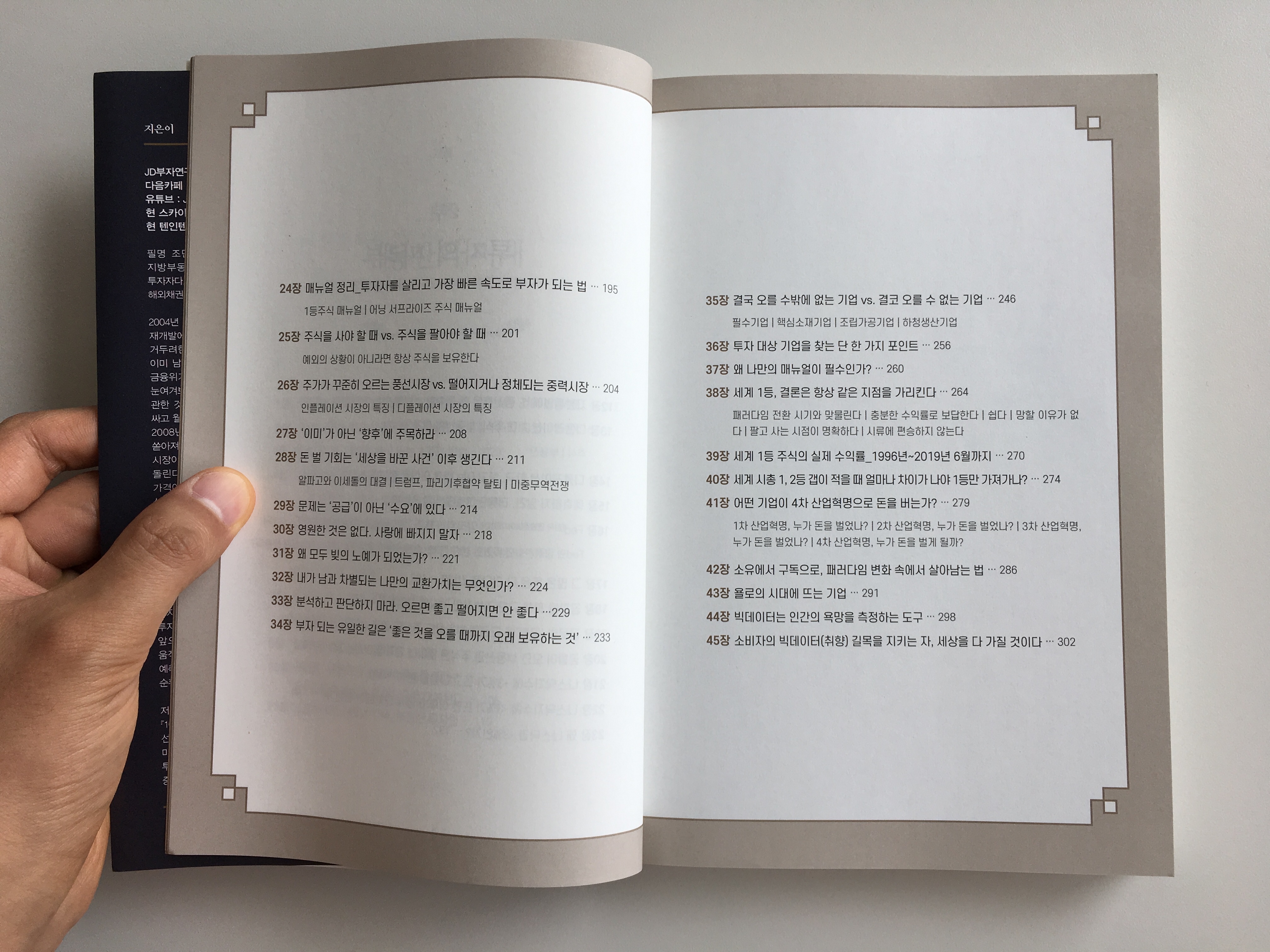 우리는 증권사 직원도 아니며, 애널리스트도 아닙니다. 재무제표도 차트도 분석하기가 쉽지 않습니다. 워런 버핏이 아닌 이상 기업 사장과 임직원들의 카르텔과 정보도 주고받을 수가 없습니다. 결론은 위에 소개된 방법이 우리에겐 안전하고 길게 갈 수 있는 방법이라는 생각이 책을 읽으면서 들었습니다.