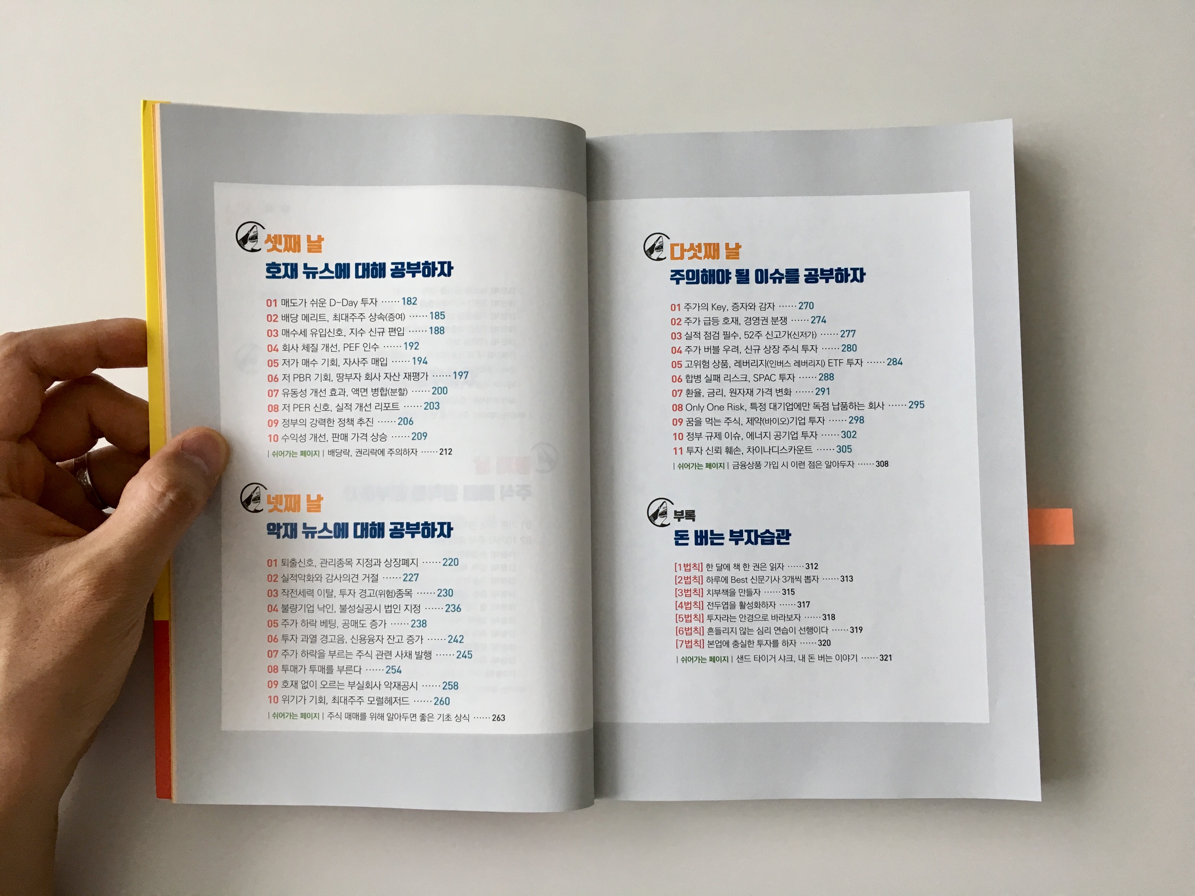 외국인과 기관 투자가 지분이 계속 감소하면 투자에 주의하자 / 최대주주가 고점에서 파는 회사는 별로다 / PBR 5배 이상은 조심해야 한다 / 부채비율 150% 미만, 당좌비율 100% 이상 기업에만 투자하라 / 배당주는 매도 현상이 심해지는 12월을 지나 1월 매수를 추천한다 / 거래량이 폭발이라면 미련 없이 오전에 매도가 바람직하다. 급등주에 있어 특별한 호재 없이 폭발적인 거래량은 세력이 빠져나가고 있는 시그널이다. (아픕니다... ㅠㅠ 책을 보아도 실천을 못하는 바람에...) / 주가 급등으로 이평선 간 간격이 벌어진 상황에서 거래량까지 터지면 단기 고점이다 / 투자 경고, 투자 위험종목은 단계별 주가급등 위험 경고로 강력한 매도 사인이다.