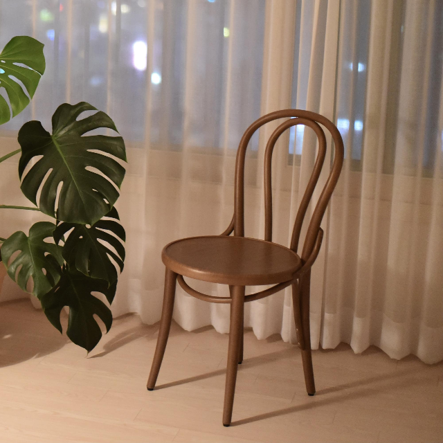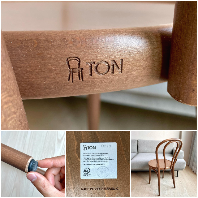 등받이를 보시면 원목이 구부러져 있는데 이것은 당시 세계 최초로 체코에서 개발한 밴딩 기법이라고 합니다. 이후에 여러 가구 인테리어 브랜드에 영향을 미쳤을만큼 이러한 디자인의 시초인 TON은 정말 대단하다고 느껴집니다.
