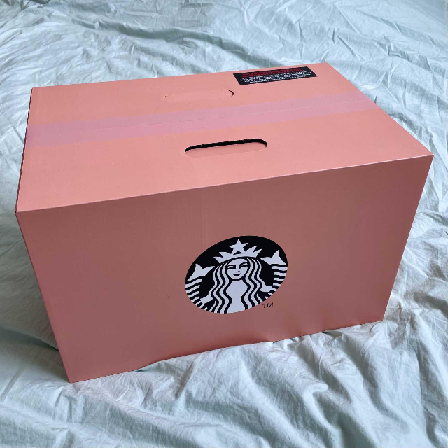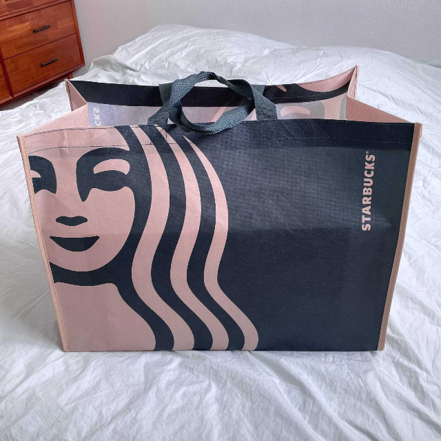 처음 받았을 때 외관 사이즈는 진짜 생각보다 큽니다. 한 품에 가득 안기는 사이즈인데요, 예전 <스타벅스 서머레디백>처럼 종이박스에 담아서 주던 것을 이번부터는 재활용 플라스틱으로 제작한 가방에 담아서 줍니다. 굉장히 질기고 거친 재질입니다.