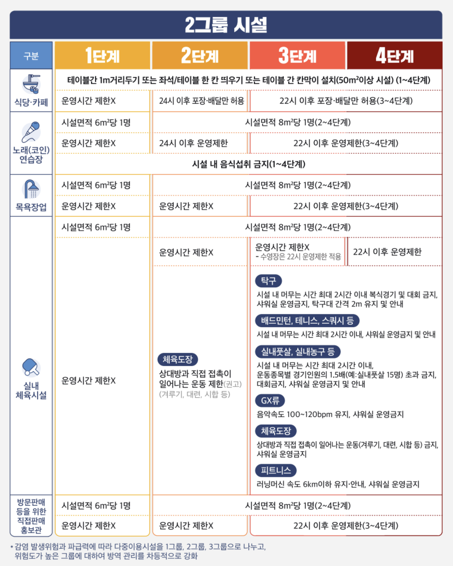 2그룹 시설 중 식당과 카페는 24시 이후 포장과 배달만 허용되며, 노래 연습장과 코인노래방(동전노래방)은 24시 이후 운영이 제한됩니다. 목욕탕과 실내체육시설의 운영시간제한은 없습니다. (단, 상대방과 직접 접촉이 일어나는 운동은 제한됩니다.)