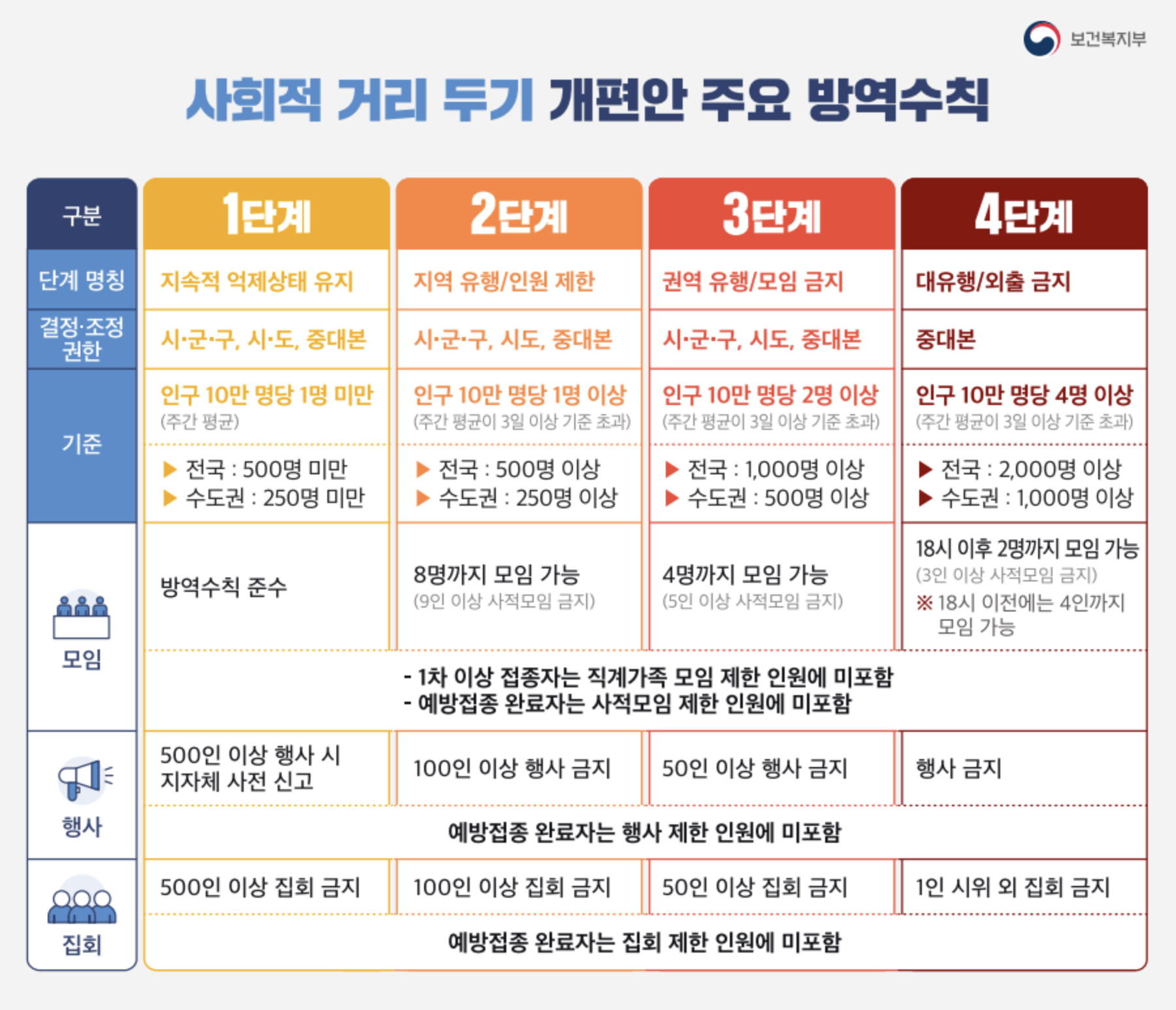 사회적 거리두기 지침이 21년 7월 이전 1단계 - 1.2단계 - 2단계 - 2.5단계 - 3단계로 이어지던 것이 7월 이후부터 1단계 - 2단계 - 3단계 - 4단계(총 4단계)로 개편안 새롭게 나왔습니다.