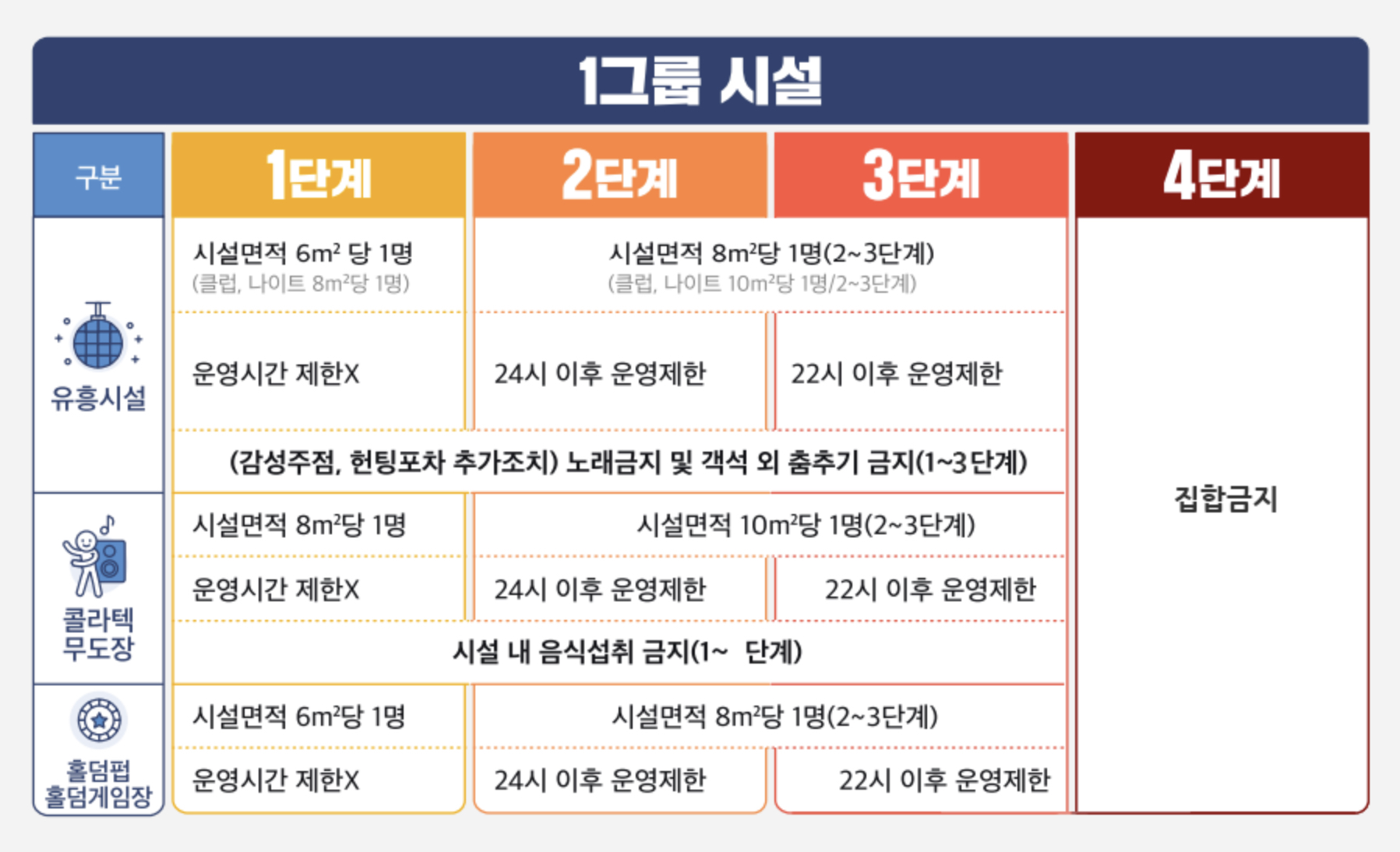 1그룹 시설(유흥주점, 콜라텍, 무도장, 홀덤펍, 홀덤게임장, 감성주점, 헌팅포차 등)은 24시 이후 운영이 제한됩니다. 그 외 노래 금지, 객석 외 춤추기 금지, 시설 내 음식 섭취가 금지됩니다. (1~3단계 동일)