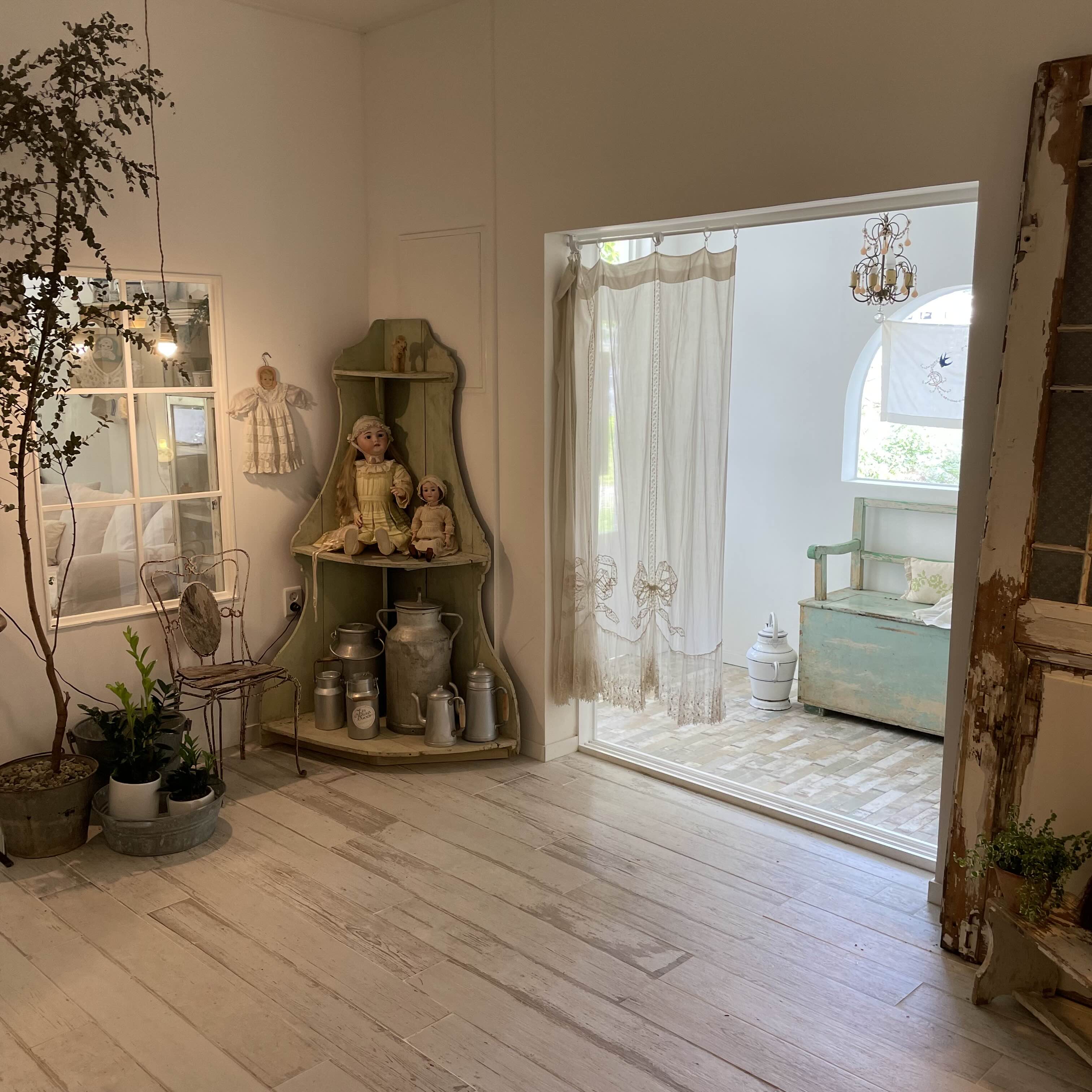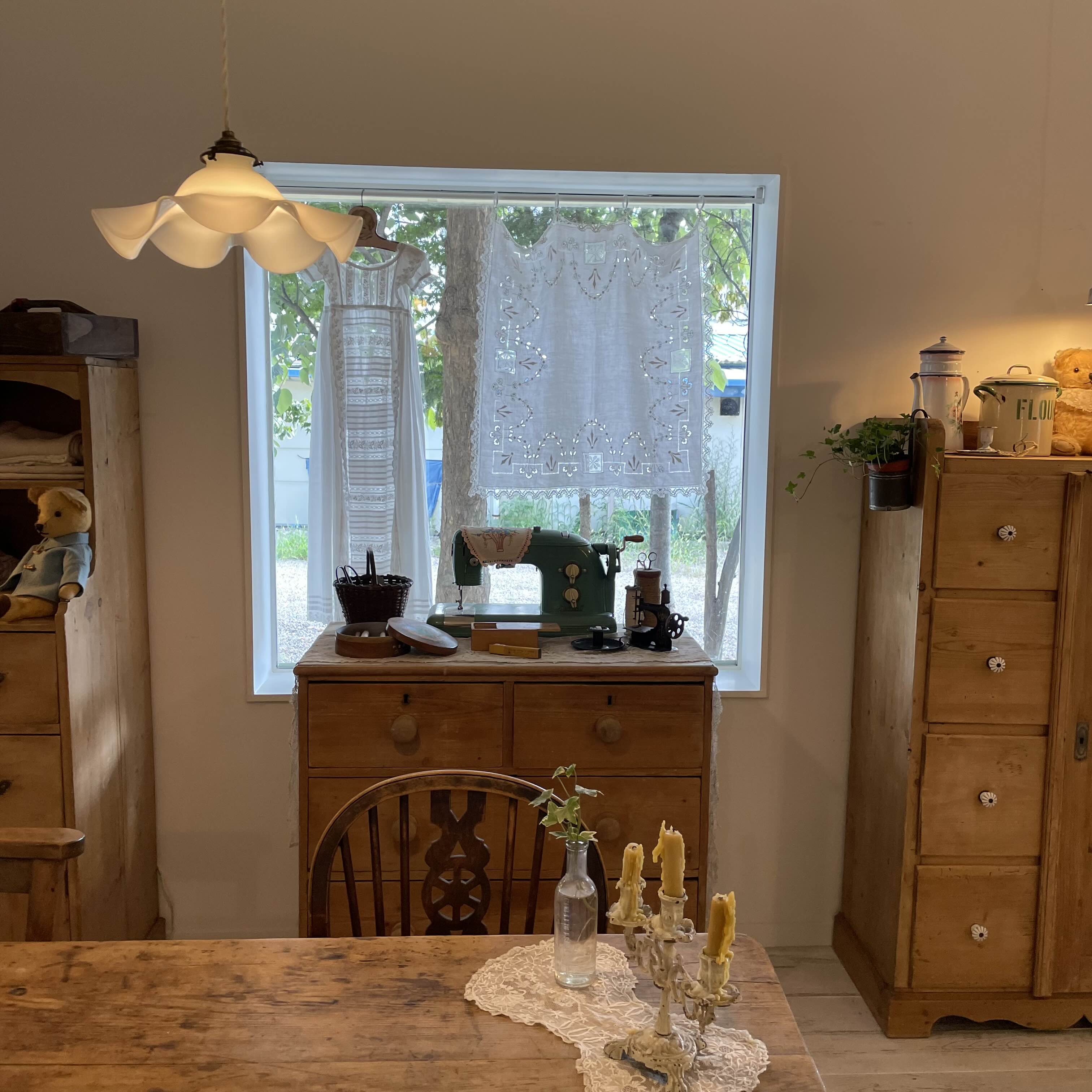 원목 테이블에 의자, 원목 마룻바닥, 원목 가구, 오래된 도자기, 엔틱한 찻잔과 주전자, 영국 인형, 수납함, 전구, 나무 문짝, 샹들리에 등 실내는 구성은 아기자기하게 잘 되어있습니다.