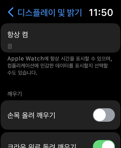 : 집에서 주로 생활할 때는 '손목 올려 깨우기' 기능을 굳이 켜 둘 필요가 없습니다. '항상 켬' 기능도 ON으로 해둘 필요가 없습니다. 나 혼자 생활하기도 하고 항상 아이폰을 붙들고 있으니 굳이 애플워치의 의존도가 높지 않은 것이죠.
