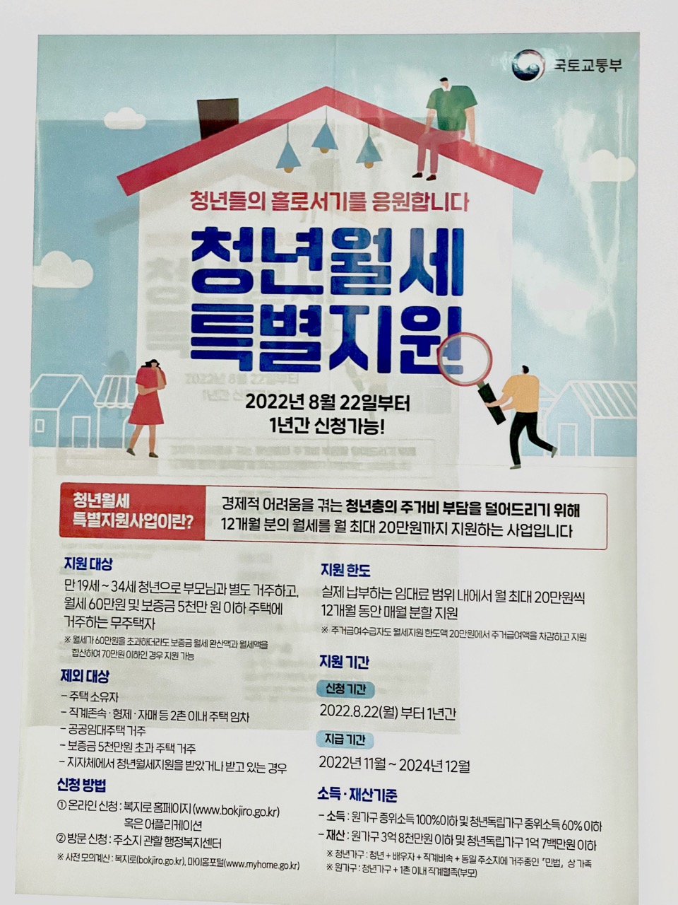 청년 월세 지원 사업말고도 정부에서 지원해주는 혜택도 많으니, 굳이 까다로운 요건을 제외하고라도 언제든지 누릴 수 있는 혜택이 있습니다. 많은 관심가져주시면 좋겠습니다.