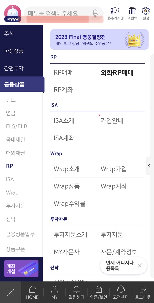 외화 RP 가입하는 방법은 생각보다 단순하고 쉽습니다. 증권사 앱에서 "외화 RP"를 검색합니다.