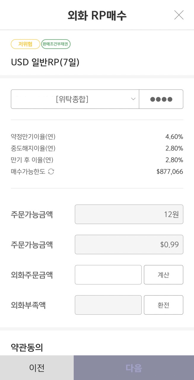위에 사진은 제가 미리 달러로 환전한 1000만원으로 외화RP를 가입한 예시내용입니다.