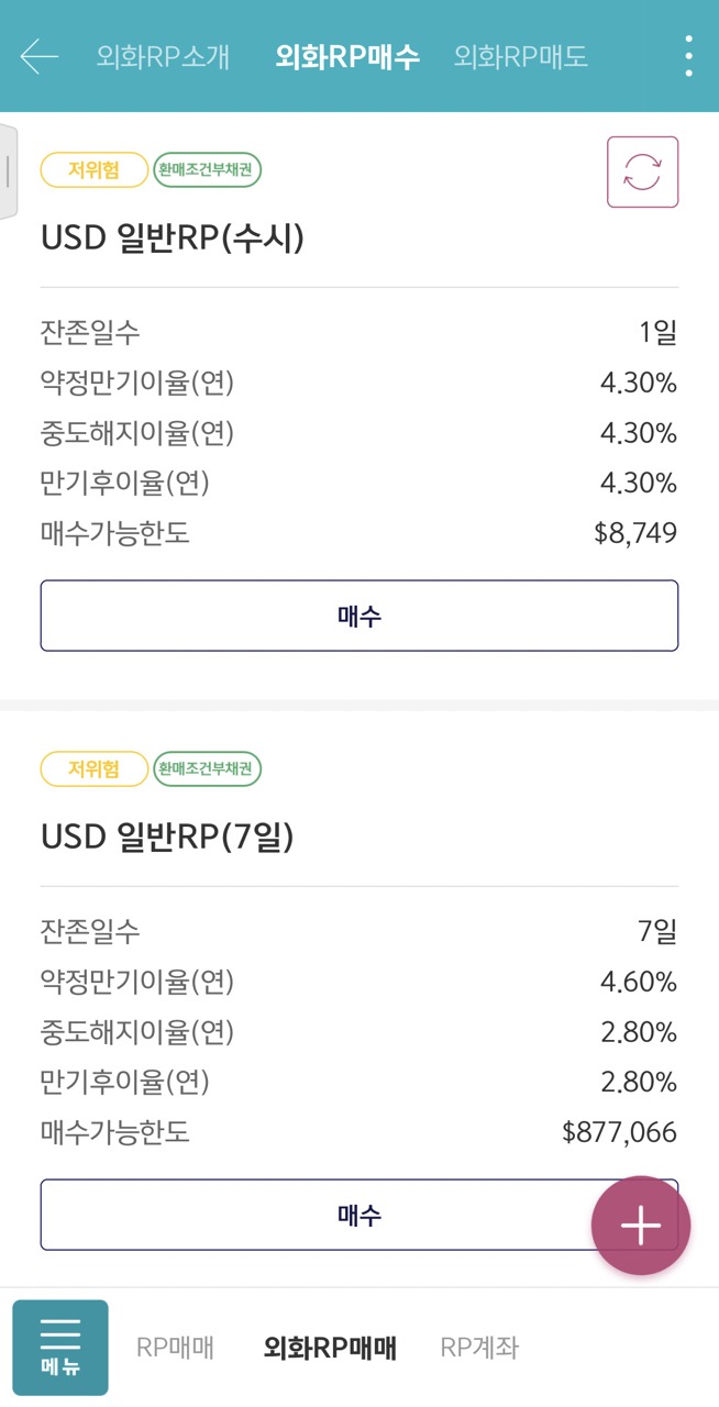이후 ✔️"외화RP매수"에서 보시면 USD 일반RP(수시)와 USD 일반RP(7일) 등 ✔️기간별로 상품이 있습니다.