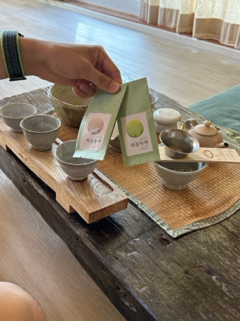 오른쪽 사진은 사장님께서 내어주신 차도구로 직접 녹차를 내려 마시는 사진입니다.