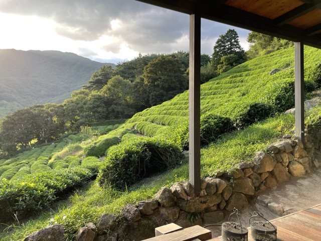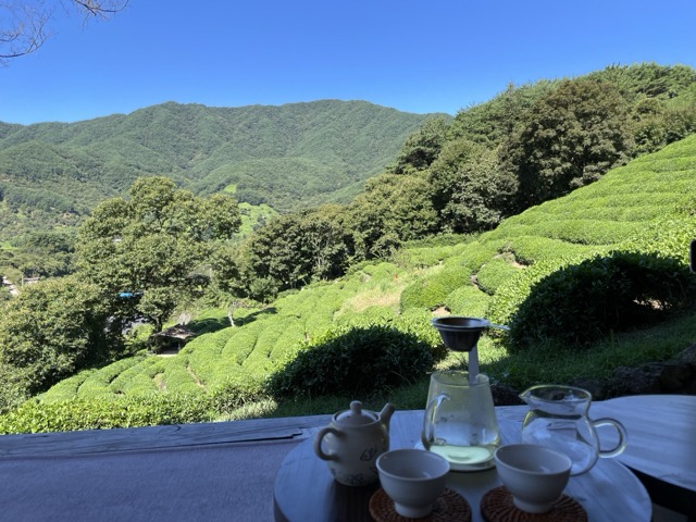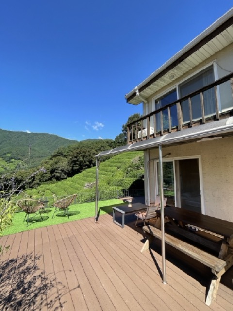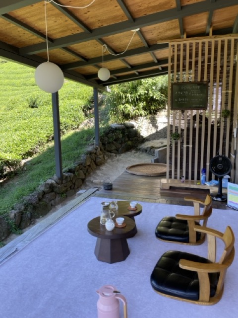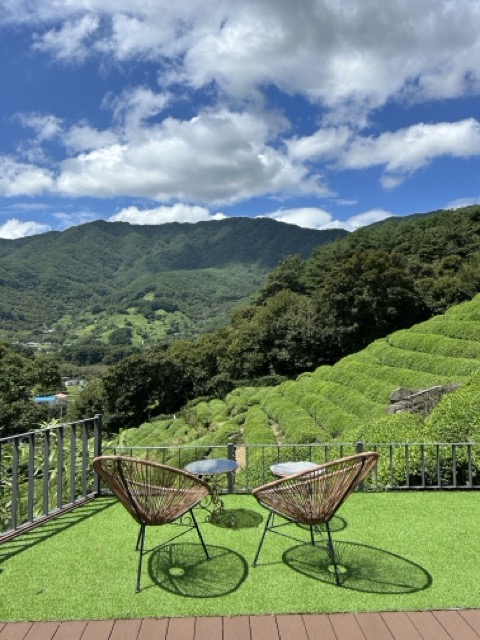 야외 테라스에서 녹차밭을 바라보면 마실 수 있는 공간과