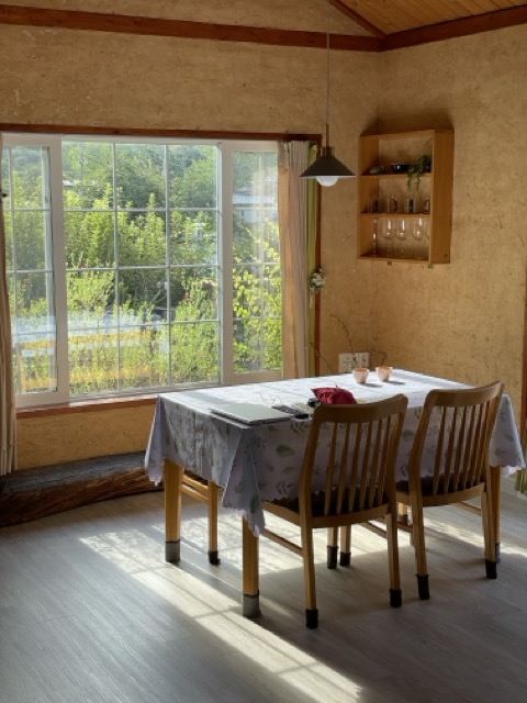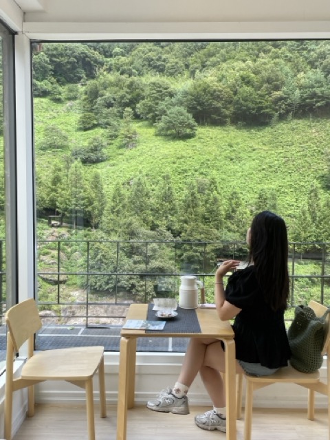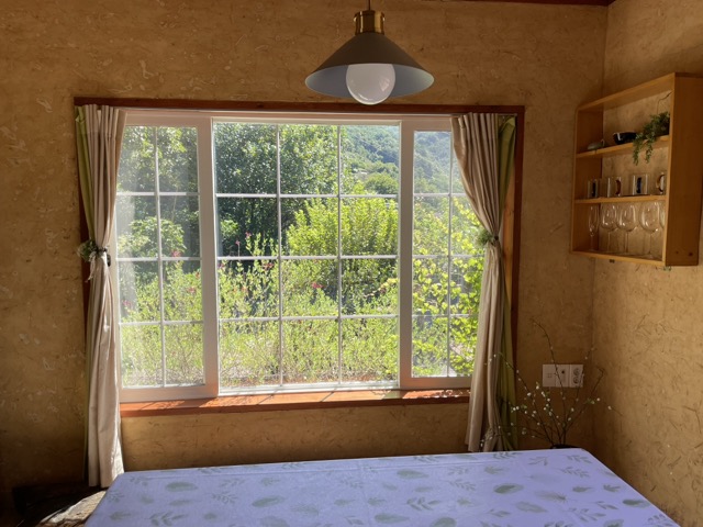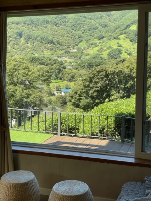 하동 펜션 유로제다에 들어가보면 예쁜 창가 너머로 보이는 자연환경이 아름답습니다.