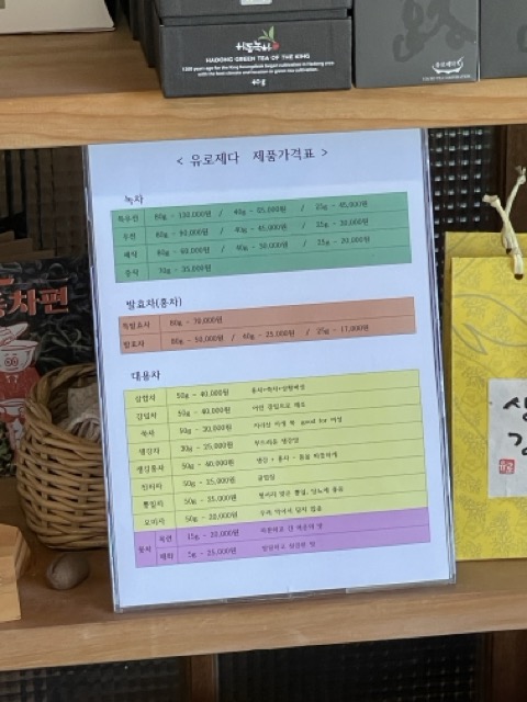 유로제다 녹차 등 제품가격표와 여러 제품들이 눈에 들어옵니다.