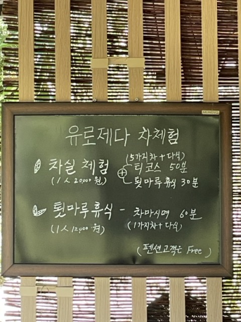 유로제다 차체험 비용은 1인당 2만원이고 야외 툇마루만 이용시 1만2천원입니다.