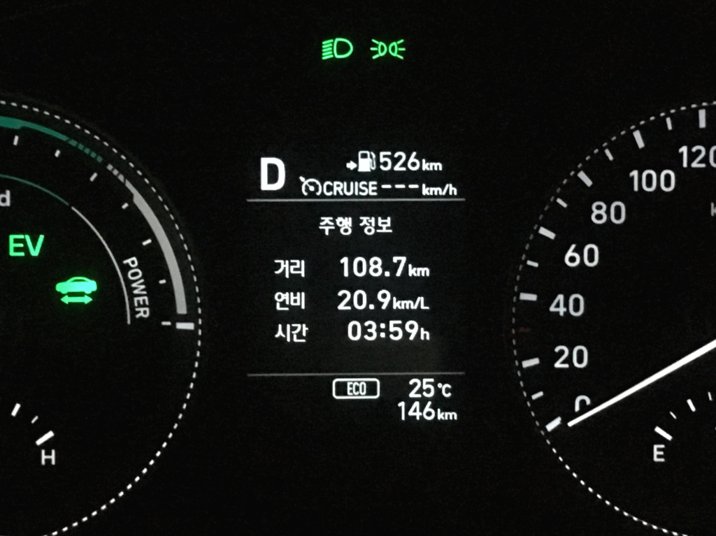 한 번은 강원도 여행 갔을 때인데 연비가 20km/l가 넘게 나와서 놀랐던 적이 있었습니다. 일반 시내 도로가 연비가 잘 나올 것이라고 생각했는데, 의외로 고속도로에서 관성주행으로 달리는 것이 연비가 더 잘 나오는 것 같았습니다.
