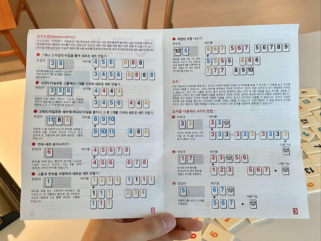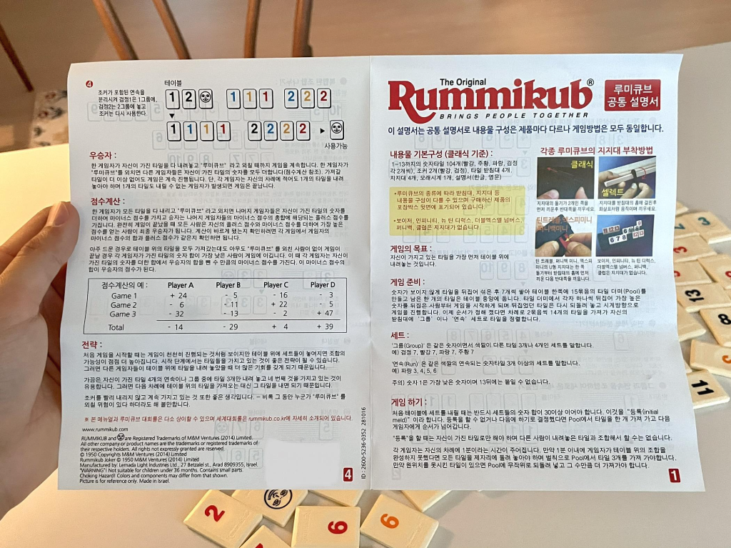 처음에 시작할 때 무조건 많은 타일들을 내려놓기보다 새로운 타일을 하나씩 모아가면서 나중에 한꺼번에 조합을 해서 내려놓는 것도 전략입니다. 또 조커를 가지고 있다면 빨리 내지 않고 상대의 심리를 이용한 다음 나중에 내는 것 또한 좋은 전략입니다. 👍