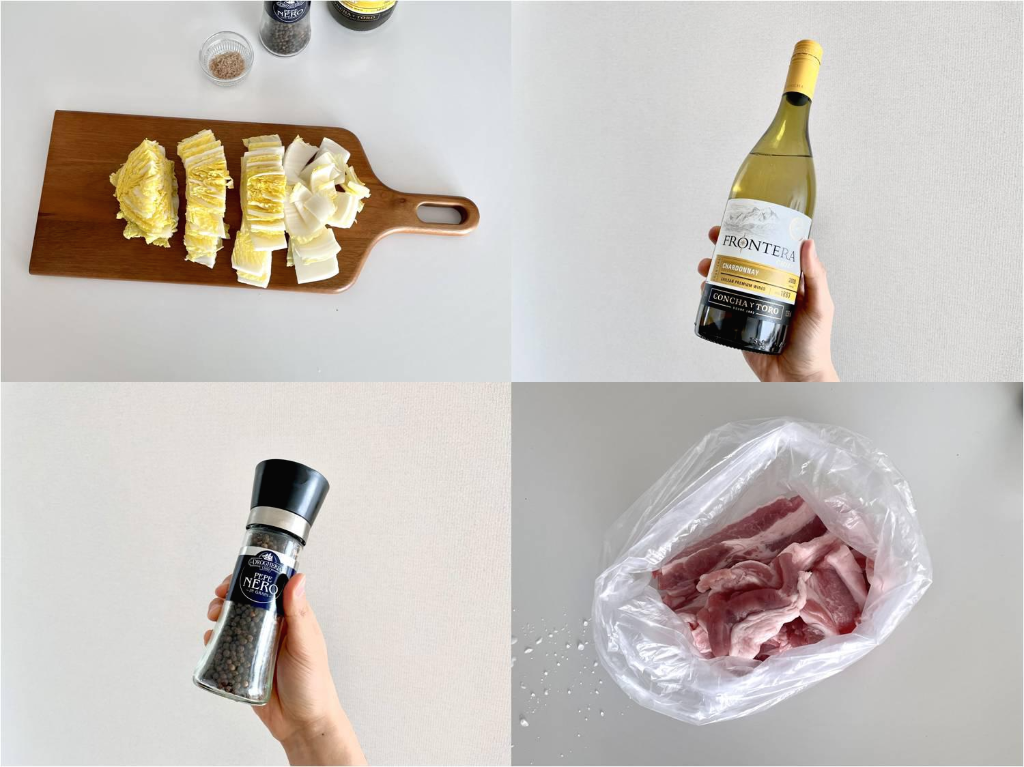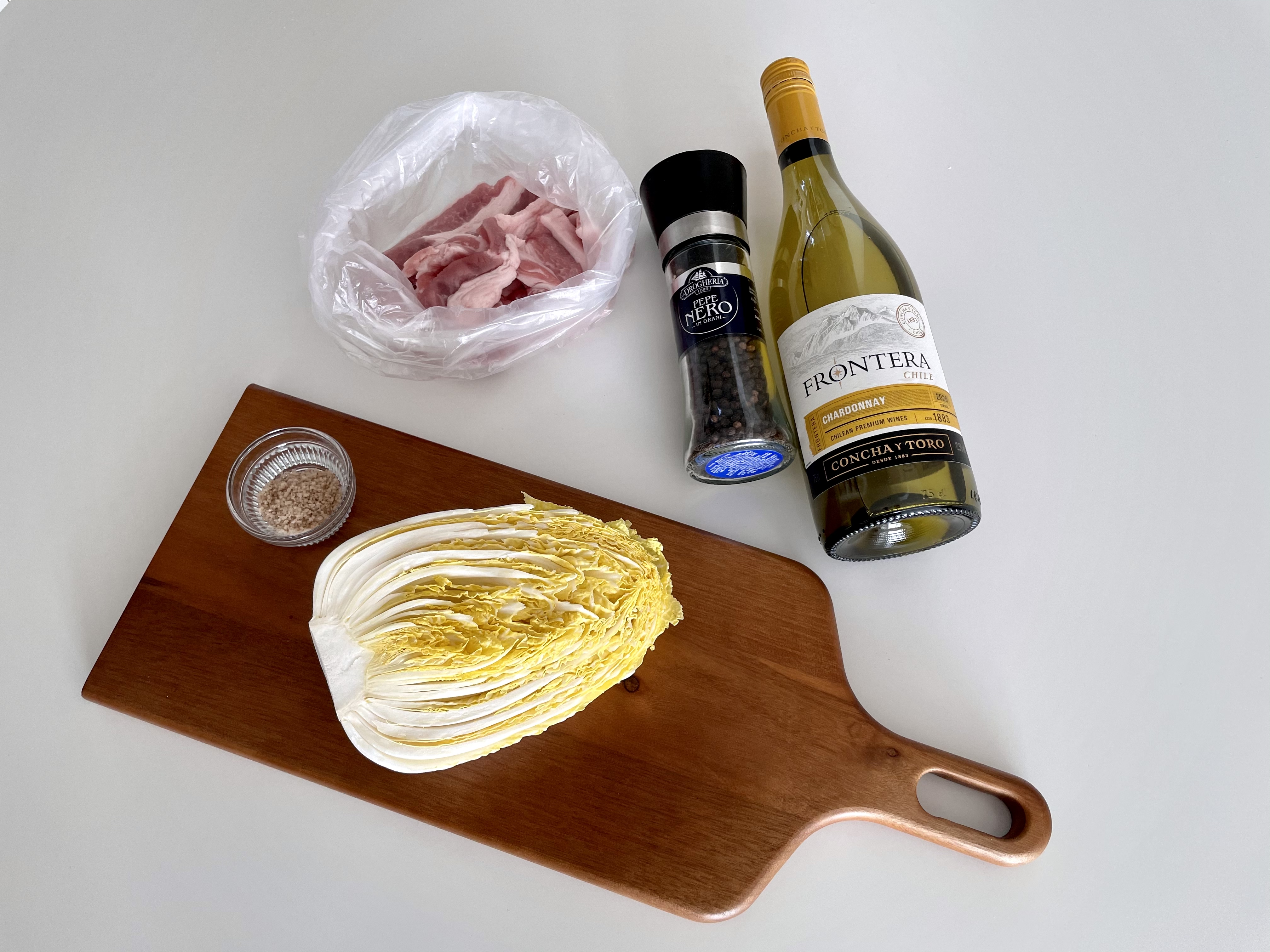 2인분 기준으로 한 준비물입니다. 재료는 1️⃣ 배추 작은 걸로 반 포기, 2️⃣ 화이트와인, 3️⃣ 삼겹살 300g, 4️⃣ 후추, 5️⃣ 소금입니다. ^^ 특히 화이트 와인은 고기 잡내를 없애고 음식 향과 맛을 내는데 중요하게 쓰입니다.